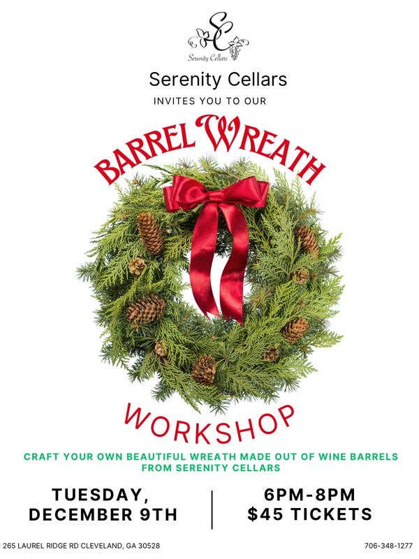 Join us for a hands-on wreath making class where you will craft your own beautiful wreath made out of wine barrels from Serenity Cellars! This event is perfect for beginners and seasoned crafters alike. We will guide you through the process of selecting materials and designing your wreath, all while you enjoy the decadent wines of Serenity Cellars.